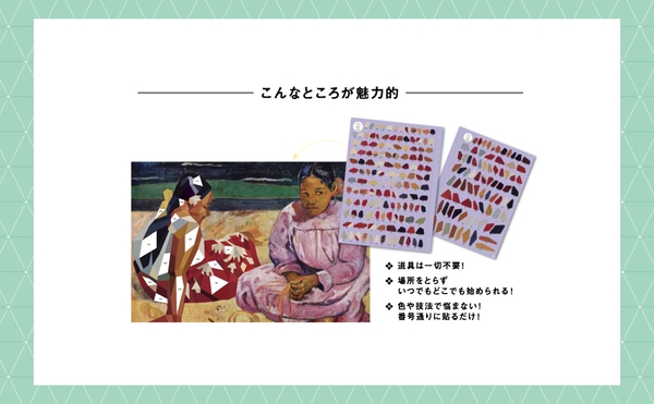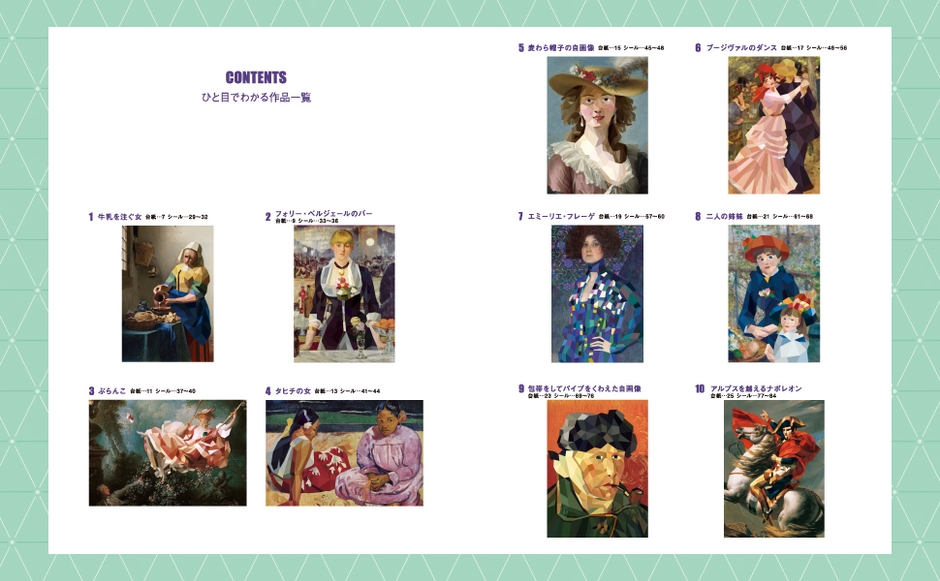 本書は、世界の名画を土台にした10 点のポリゴンアート作品にシールを貼りつけて完成させるアクティビティブックです。