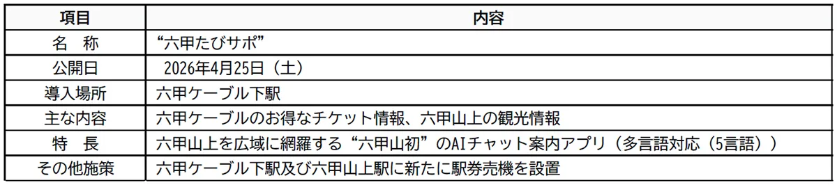 神戸六甲鉄道株式会社(本社:神戸市灘区、社長:川邉直哉)は、六甲ケーブルのお得なチケットの情報やアクセス情報、六甲山の観光施設の情報を案内する、多言語対応(5言語)のAIチャットアプリ「六甲たびサポ」を開発し、2026年4月25日(土)から六甲ケーブル下駅で公開します。