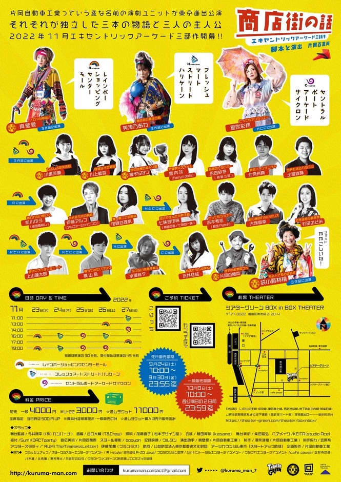 片岡自動車工業(代表:片岡百萬両)主催、片岡自動車工業 東京進出公演『商店街の話~エキセントリックアーケード3部作~』が2022年11月23日 (水・祝) ~2022年11月27日 (日)にシアターグリーン BOXinBOX THEATER(東京都豊島区南池袋2-20-4)にて上演されます。