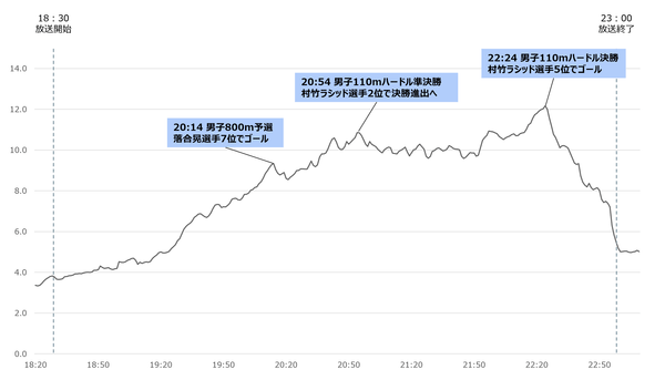 その後、20:54に再度視聴率が上昇していますが、この時間は男子110mハードル準決勝で村竹ラシッド選手が2位でゴールし決勝進出を決めた場面でした。