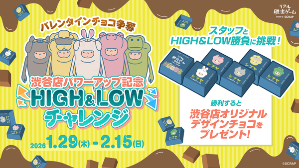 全世界で累計1,500万人以上を動員しているリアル脱出ゲームを企画制作する株式会社SCRAP(本社:東京都渋谷区、代表:加藤隆生)は、「リアル脱出ゲーム CROSSING 渋谷店」(東京都渋谷区宇田川町)にて新作イベントが開催されることを記念したキャンペーン『渋谷店パワーアップ記念 HIGH&LOWチャレンジ』の開催を発表いたします。