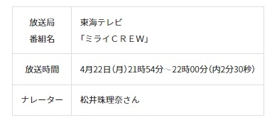 本日から放送が開始される東海テレビのミニ番組「ミライCREW」で、本学理工学研究科の江﨑響さんが紹介されます。