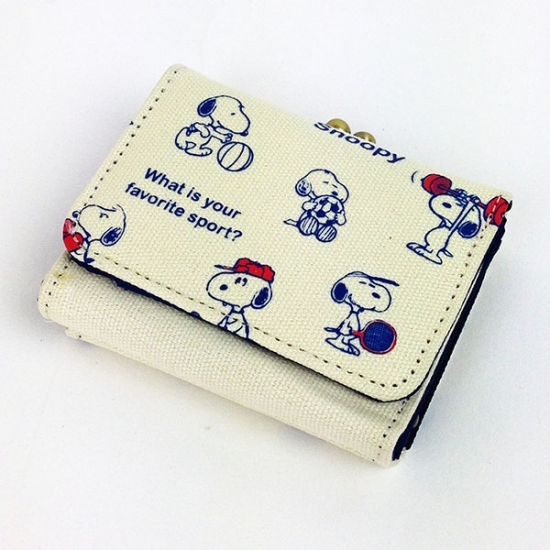 コンパクトな三つ折り財布です。サッカーやバスケ、テニスなどをしているスヌーピーのデザインがキュート♪