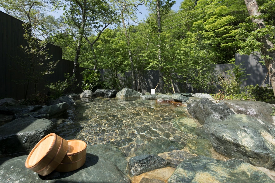 大自然に囲まれた露天風呂と、ヒノキの香りに包まれた内湯。
