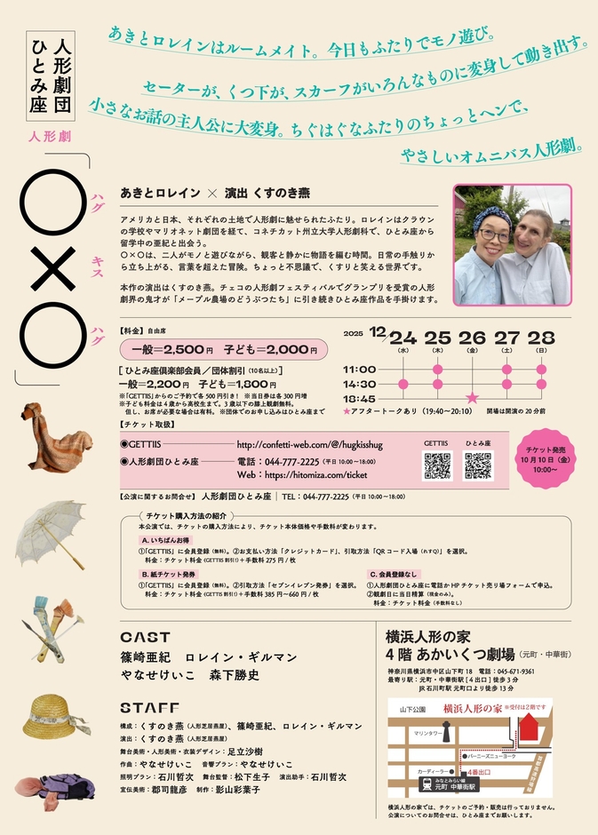 「〇×〇(ハグ キス ハグ)」は、ちぐはぐなふたりのちょっとヘンで、やさしいオムニバス人形劇です。日常の手触りから立ち上がる、言葉を超えた冒険。ちょっと不思議で、くすりと笑える世界――。クリスマスから年の瀬のあわただしい時期に、ぜひ静かに物語を編む時間をお楽しみください。