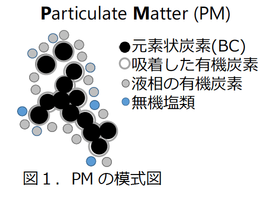 一方、人体への健康影響が問題視される粒子状物質(PM)は、図1に示すように、BCの他に、有機炭素、無機塩類が含まれる複合体となっています。そのため、NH3混焼率の増加により排出量が減少するかは自明ではなく、また、NH3混焼時のPM計測もこれまで例がありませんでした。