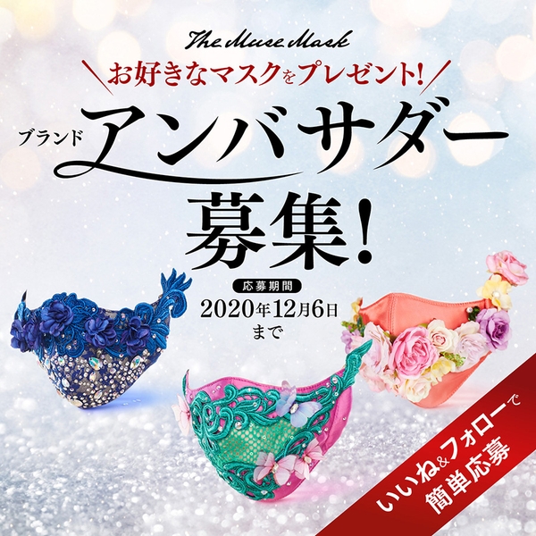 さらに、装着シーンなどのSNS投稿を条件に、お好きなThe Muse Mask製品を一枚無料で提供するブランドアンバサダーの募集も開始します。募集期間は2020年11月27日(金)~12月6日(日)と、年末年始のパーティーシーンにも合わせられるスケジュールになっています。これまでお買い上げいただいたお客様からも『パーティにつけていくのがとても楽しみです。(57歳)』『マスクのおかげで自信がつき、笑顔で踊れました。(63歳)』『素敵なマスクをつけているだけで、テンションがアップします!(55歳)』『マスクとドレスが一体となって、気持ちまで華やかな気分になります。(48歳)』といった沢山の悦びの声をもらっています。ブランドと共に、どんな状況でも自分を輝かせ、人生を楽しみたい方を応援するアンバサダーとなってくれる貴方をお待ちしています。