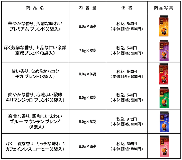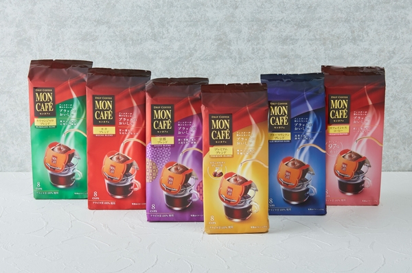<モンカフェ>ならではのカップ オン タイプのドリッパーを中心に、全6種のブレンド カラーを配色したデザインは、ブレンドの違いが一目でわかりやすく、おいしさとともに、選ぶ楽しさも演出します。また、容量を10袋入りから8袋入りに変更することで、より気軽に手に取りやすい価格帯になりました。