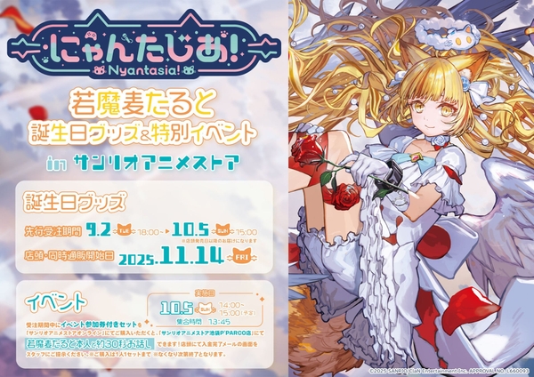 株式会社ClaN Entertainment(本社:東京都港区 代表取締役社⻑:⼤井 基⾏、以下ClaN)は、株式会社サンリオ(本社:東京都品川区)と共同で行うVTuberプロジェクト「にゃんたじあ!」に所属する「若魔麦たると」が9月2日に誕生日を迎えたことを記念し、誕生日グッズの販売を行います。