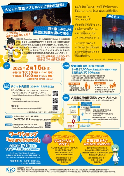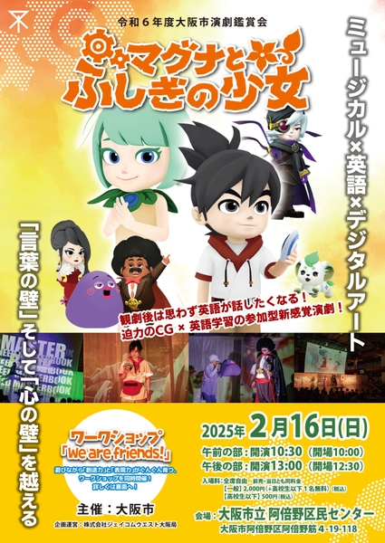 大阪市主催、『マグナとふしぎの少女』が2025年2月16日 (日)に阿倍野区民センター(大阪府 大阪市阿倍野区 阿倍野筋 4丁目19-118)にて上演されます。当日は上演のほか、ワークショップも同時開催されます。