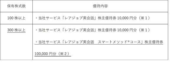 株主の皆様におきましても、これまでのオンライン英会話「レアジョブ英会話」だけでなく、当社の新たなサービスをぜひご体験いただき、ご理解を深めていただくことで当社株式に対する魅力をより一層感じていただきたく、株主優待の拡充を実施することとなりました。