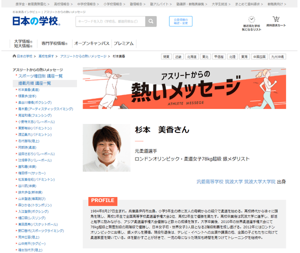 全国の大学・短大・専門学校などの学校情報を提供する、株式会社JSコーポレーション(本社:大阪市北区 代表取締役社長:米田英一)は、アスリートからの熱いメッセージ「柔道/杉本美香さん(https://school.js88.com/scl_h/onepoint-advice/sport?item=16&athlete=220)」を公開しました。