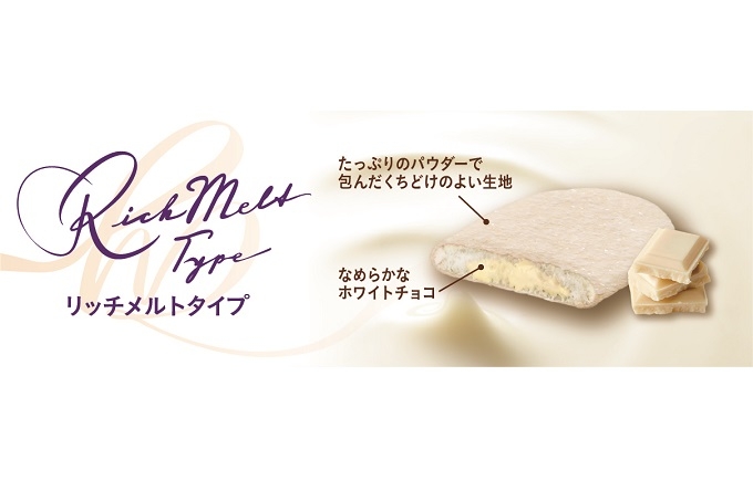 国産米を使用したやわらかな生地に北海道産ミルクパウダーを使用したホワイトチョコをしみ込ませ、たっぷりのパウダーで包み込んだ “リッチメルトタイプ”の新商品です。