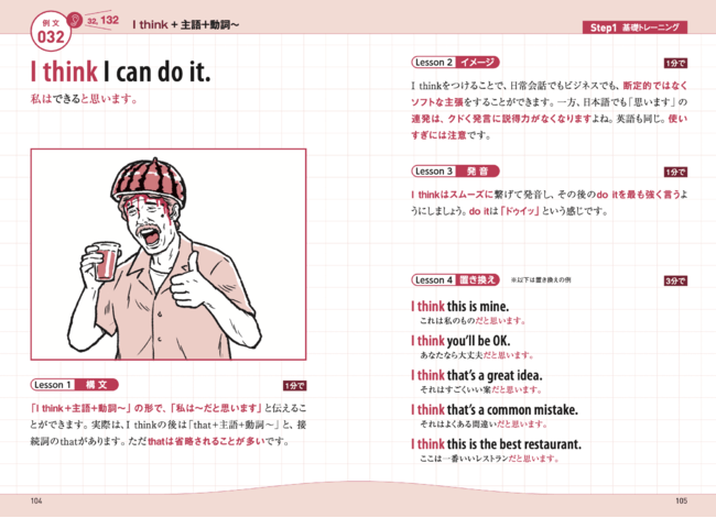 100例文を武器に、「自己紹介」「将来の夢」などワンテーマを、1分近く英語でしゃべり通すトレーニングも行い、実際にできるようになります。記憶の定着に一役買ってくれる千野エーさんによるジョークの効いたイラストもポイントです。1か月後には、スラスラと楽しく英語を話しているあなたがいるでしょう。
