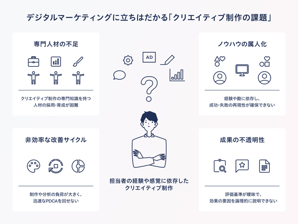デジタルマーケティングは、飛躍的な進化を遂げ、企業のマーケティング活動を効率化しました。しかし、その一方で広告効果を大きく左右するクリエイティブ制作の領域は、いまだ属人化やナレッジの分散、制作スピードの不均一といった課題を抱えています。特にインハウスでデジタルマーケティングに取り組む企業では、限られた人員体制の中でクリエイティブ制作を行うため、こうした課題がより顕著に表面化しています。