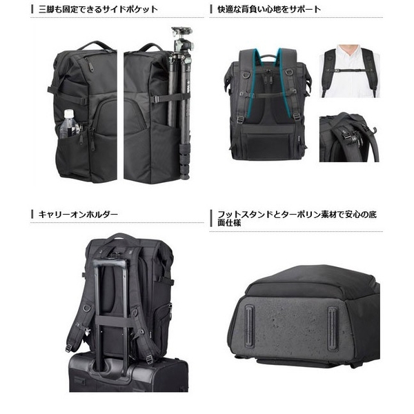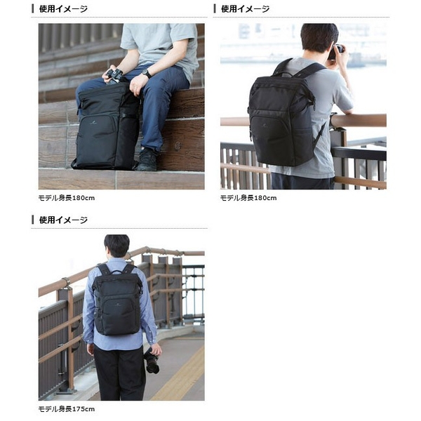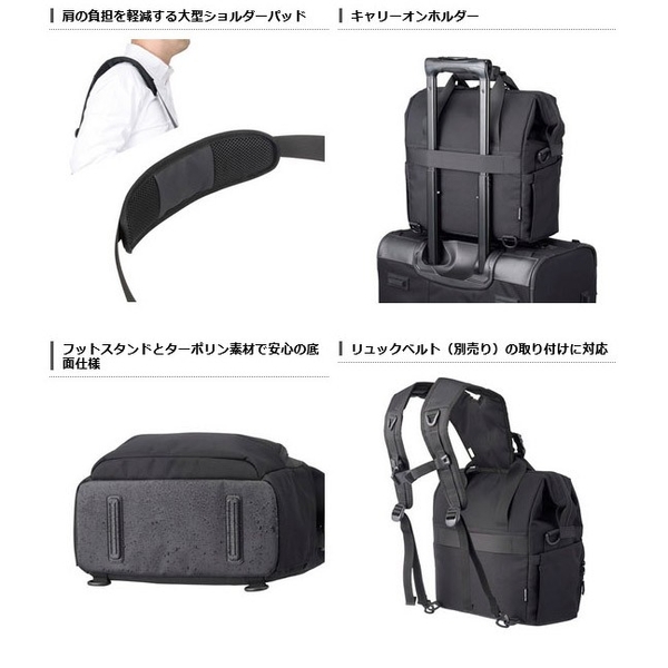 天面にはがま口タイプで大きく開くトップフレーム構造を採用、背面側にも機材の一覧性に優れ整理しやすいフルオープンの開口部を備えたバックパック。