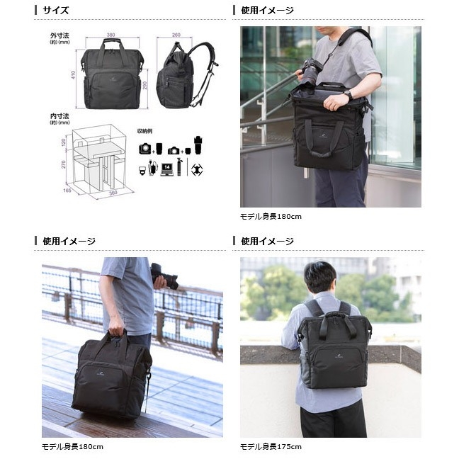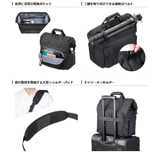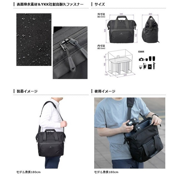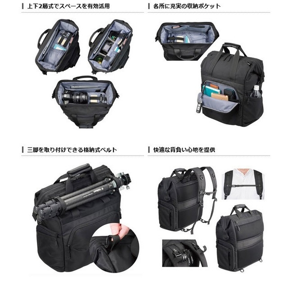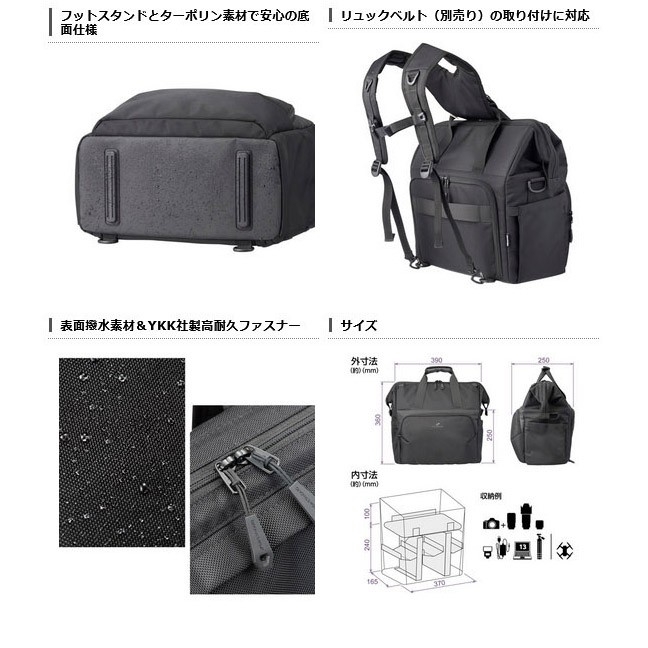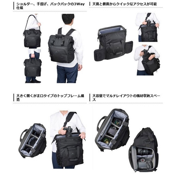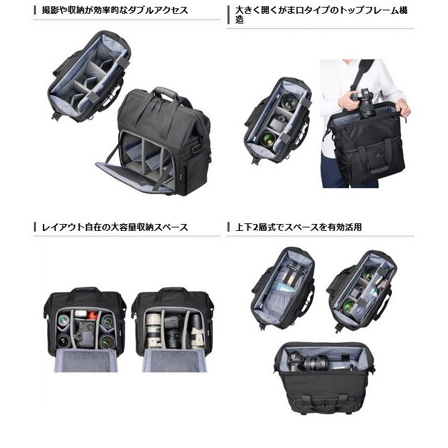 がま口タイプの大きく開くトップフレーム構造で機材の出し入れがしやすく、大容量の機材収納スペースは両サイドからもアクセス可能。スピーディーな撮影と快適な持ち運びを両立し、あらゆる撮影スタイルに対応する多機能でマルチユースなカメラバッグです。