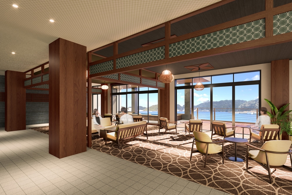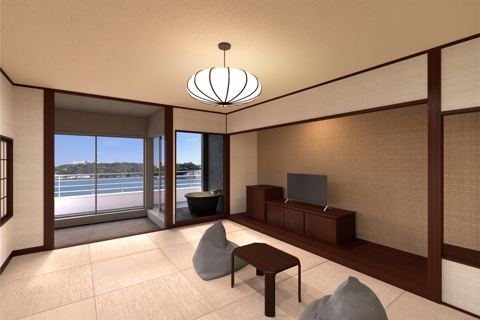 今回のリブランドで「大江戸温泉物語Premium 越之湯」は、大浴場やレストラン、ラウンジなど館内のいたるところで勝浦湾の絶景を望むことができる「洗練された和の温泉リゾートホテル」に生まれ変わります。
