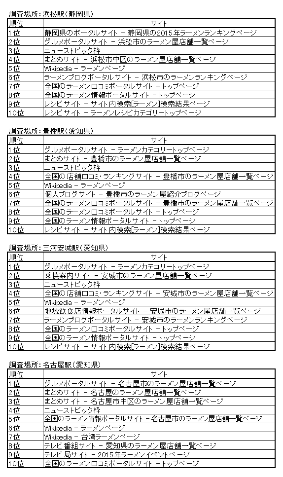 地域別の1位表示についても差が出ており、これまででは「ラーメン●●(地域名)」などのキーワードで検索する際に表示されるような地域属性の強いサイトが抽出されております。(東京駅の「Wikipedia - 東京ラーメン」、岐阜羽島駅の「グルメポータルサイト - 羽島市のラーメン屋店舗一覧ページ」など)