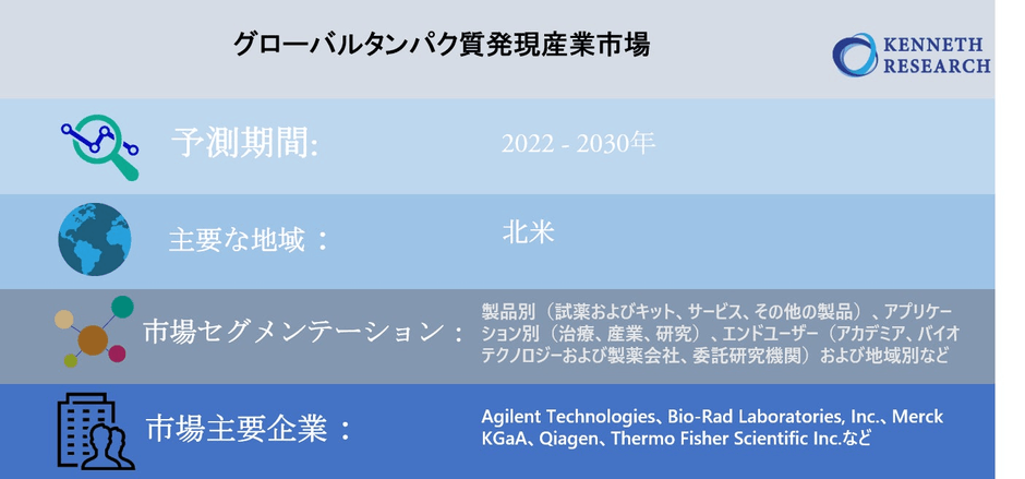 リサーチ・ネスターの一部門であるケネス・リサーチは、2022年1月3日に「世界のタンパク質発現産業市場:世界の需要分析と機会の見通し2030」と題する調査レポートを発表しました。詳細な市場業界の需要分析と、市場の成長に影響を与えるさまざまな要因を提供します。このレポートは、予測期間、市場価値、市場規模、成長率、セグメント、市場プレーヤー、成長ドライバーなど、市場の成長を提供します。調査方法には、市場評価と予測データ計算に基づいて過去および現在のデータを収集することが含まれます。このレポートのデータ収集には、一次調査と二次調査の両方が含まれます。