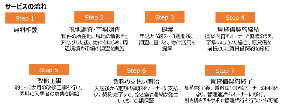 首都圏を中心に、空き家を「アキサポ」が借り受け、「アキサポ」全額費用負担でリノベーション工事を行い、