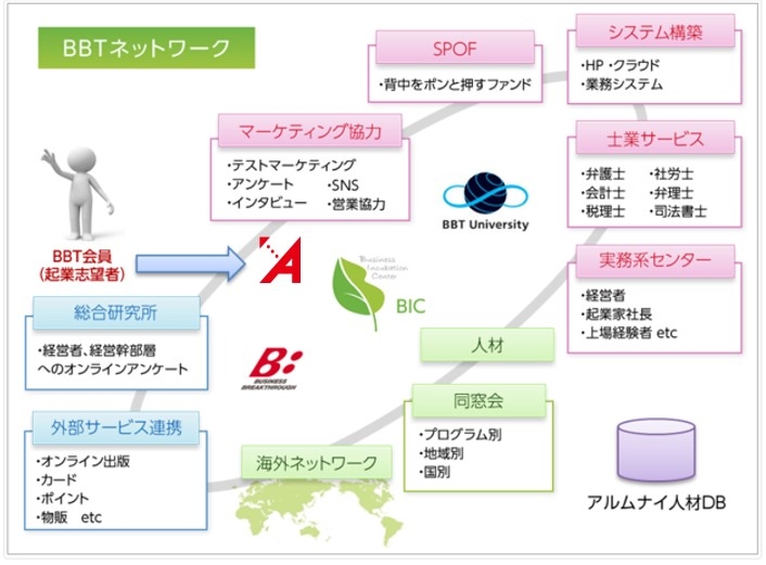 BICは起業を志すBBTの在学生・卒業生を支援する目的で2014年7月に設立されました。BBTプログラム出身者で起業を志す方々を対象に、BBTの中核人材ネットワークを駆使して、経営および営業・マーケティングを重視した起業支援を無償で行っています。具体的な活動として、起業家のネットワークを構築するためのコミュニティやイベントの提供に加え、BBT大学大学院の余語邦彦教授兼BICセンター長や張秋華教授、BBT大学の菅野誠二教授ら経験豊富な実務家教員による個別コンサルティングも行っています。