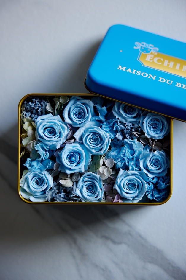 本セットは、エシレを象徴するブルー缶とホワイト缶の2缶構成。ブルー缶には、青いバラを基調とするHanahiroのプリザーブドフラワーを丁寧にしつらえました。“枯れない=想いが続く”という象徴性と、青いバラの花言葉「夢が叶う」は、これからの幸せを願う気持ちを託す母の日ギフトにぴったりです。