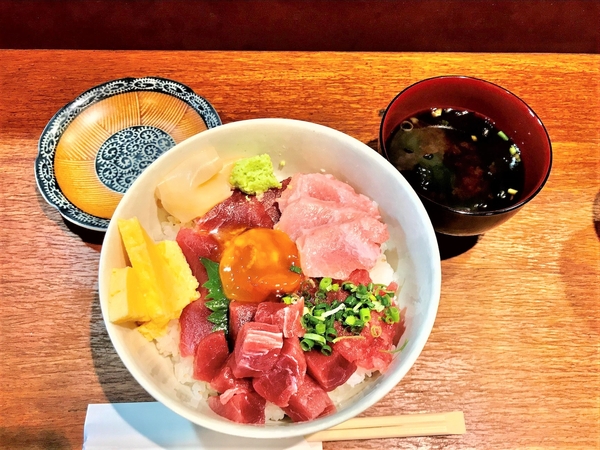まぐろの仲卸12年のキャリアを持つ店主が、市場価格で食べて頂きたいという一心で提供しているこだわりの美味しいまぐろ丼です。本マグロの大トロ、中トロ、赤身、ネギトロの四重奏を950円という市場価格でお楽しみください。