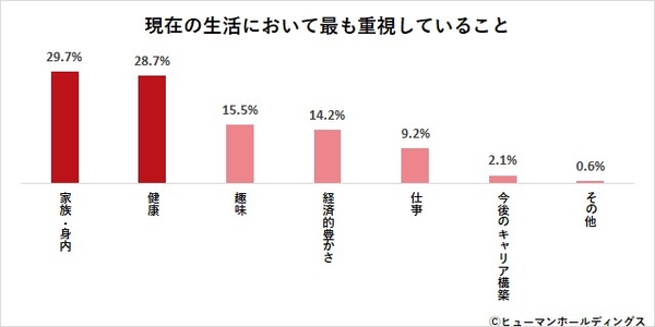 「現在の生活において最も重視していること」については、「家族・身内(29.7%)」「健康(28.7%)」が多い結果となりました。
