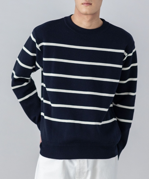 白を中心に配色したインパクトのある太ボーダーニットは、大人のカジュアルスタイルに取り入れたいアイテム。一枚着にもレイヤードにも使える万能なデザインで、気軽に着られるウォッシャブル仕様です。