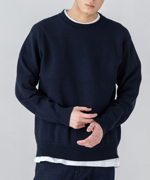 一見無地のようにも見えて、編地の切り替えでボーダーを表現しているこだわりのデザイン。さりげないが奥行きのあるデザインは、まさに大人のためのニット。軽い着心地で、アウターとの着合わせも抜群です。