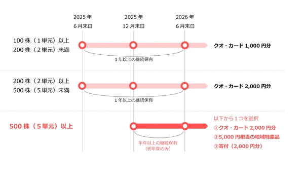 A2:100株(1単元)以上200株(2単元)未満の株主優待は、下図のとおり2025年6月末日及び2025年12月末日並びに2026年6月末日の当社株主名簿に100株(1単元)以上200株(2単元)未満の株式を保有していることが記載または記録されている株主様に、2026年9月下旬の株主優待品(クオ・カード1,000円分)の進呈を最後に廃止いたします。