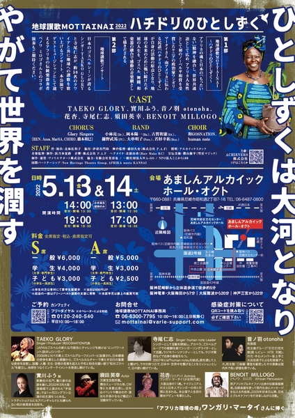 日本のゴスペルシーンが誇るシンガーTAEKO GLORYと寺尾仁志が、約50名のクワイアと共に地球への讃歌を歌い上げるコンサート。本公演でゲストミュージシャンとして迎えるアフリカの伝統楽器奏者 ベノワ ミロゴさんとのコラボ演奏もご期待ください。