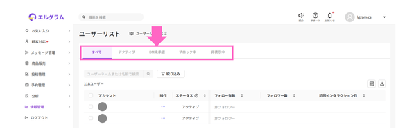 エルグラムのユーザーリストは、ツールに登録されている全ユーザーを一覧で確認できる基本機能です。絞り込み機能を使えば、特定の条件や行動を持つユーザーだけを抽出することもできます。