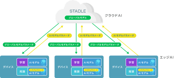 STADLE™は、エッジAI側の生データを共有することなく、エッジAIのモデルを学習させることができます。具体的には、エッジAI側のローカルAIモデルのパラメータのみを集め、クラウドAI側でそれらを統合したグローバルモデルを生成し、それらをエッジAI側に返すことで、エッジAIの学習を推進することが可能です。生データを共有しないため、従来のコンピューティングリソースやネットワークリソースの圧迫や処理遅延の問題を解消することができます。