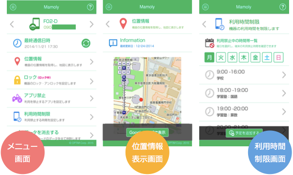 「mamoly」とは、企業向けモバイル管理サービス(MDM※3)を提供しているオプティムが開発した「お子さま見守りサービス」です。「mamoly」は、お子さまを見守るための複数の機能を持っています。