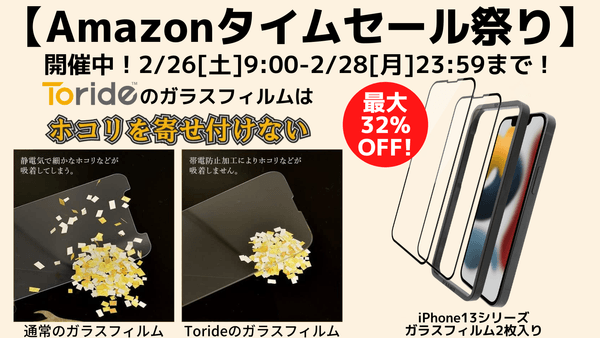 【Amazon限定ブランド】「Toride(トリデ)」は、ネット通販サイト「Amazon.co.jp」にて、2月26日(土)から2月28日(月)の期間中、「Amazonタイムセール祭り」にてiPhone13 / 13 Pro / 13 mini / 13 Pro Maxでご利用いただけるガラスフィルム2枚組を最大32%OFFで販売中です!