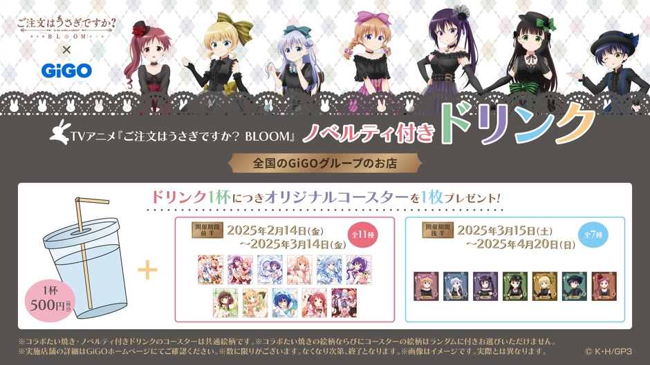 株式会社GENDA GiGO Entertainment(本社:東京都港区 代表取締役社長:二宮 一浩 以下当社)は GiGOグループのお店におきまして、人気アニメ『ご注文はうさぎですか? BLOOM』とのコラボキャンペーンを2025年2月14日(金)より開催いたします。 本キャンペーンは描き下ろし/原作イラストを使用したコラボたい焼き、ノベルティ付きドリンクの展開と株式会社キャラバン(本社:東京都千代田区、代表取締役:東 貢一郎)主催のポップアップイベントでお届けいたします。