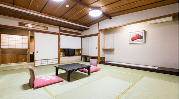 写真の客室は定員12名。2間続きの和室とリビングスペース、廊下なども広々としており、3世代旅行やグループ旅にぴったり。