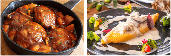 右:ふんわり焼き上げたオムレツには、トリュフ香るきのこクリームソースを掛けてご提供いたします。
