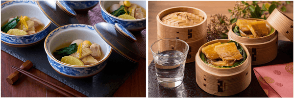 右:中国料理・東坡肉(トンポーロー)をわっぱ飯にアレンジ。豚バラ肉と玉ねぎをじっくり煮込み、麦飯に乗せ、わっぱで蒸してご提供します。わっぱの蓋を開けた瞬間の香りや湯気に食欲がそそられます。