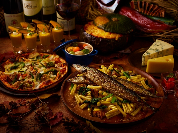 料理のテーマは「旬の味覚」と「秋スイーツ」。旬の食材が豊富なこれからの季節を存分に味わえるメニューをご用意いたします。店内にはライブコーナー”鰹の炙り焼き”の食欲そそる香りが広がります。くり抜いたかぼちゃを丸ごとグラタンにした”かぼちゃのとろっとアッシパルマンティエ”や脂ののった秋刀魚と茄子のパスタ、さつまいもの甘味とチーズの塩気が相性ぴったりの”さつまいもとチーズのダッカルビピッツア”など、他にも食材の旨味をご堪能いただけるメニューを取り揃えております。