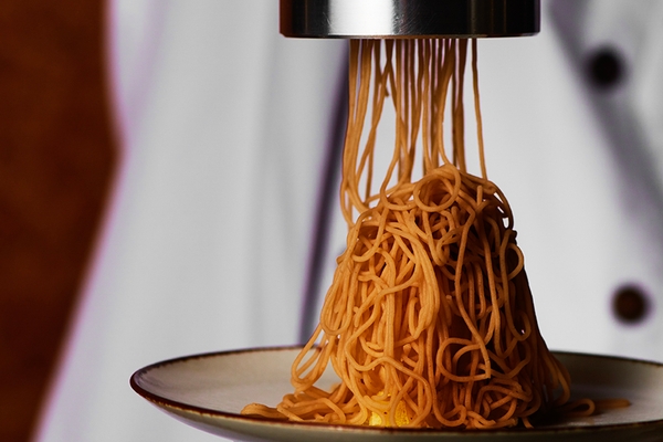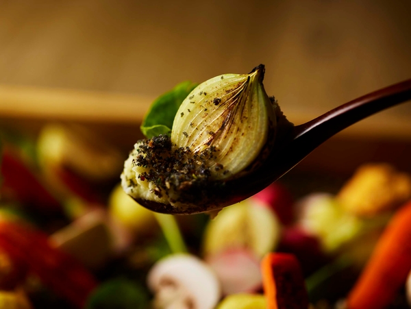 前菜のおすすめは収穫祭をイメージした“彩り野菜の菜園風”。土に見立てたマッシュポテトから野菜をすくってお召し上がりいただくこのメニューは、まるで自分で収穫をしているような感覚をご体験いただけます。チーズ、バジル、アンチョビをベースにした3種類のディップソースもご用意。取り分ける瞬間からわくわくする、遊び心たっぷりのメニューです。