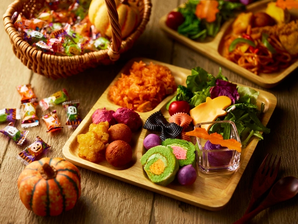 お子様コーナーにはハロウィーン風にアレンジされたメニューが並びます。フライドポテトやチキンライスに加え、コウモリに見立てたパスタを使ったサラダやチーズボール、他にも紫色のスイートポテトなどスイーツも充実。さらにレストランスタッフに合言葉を伝えれば、ハロウィーンキャンディがもらえるかも!※ハロウィーンキャンディのプレゼントイベントは近日公開予定です。