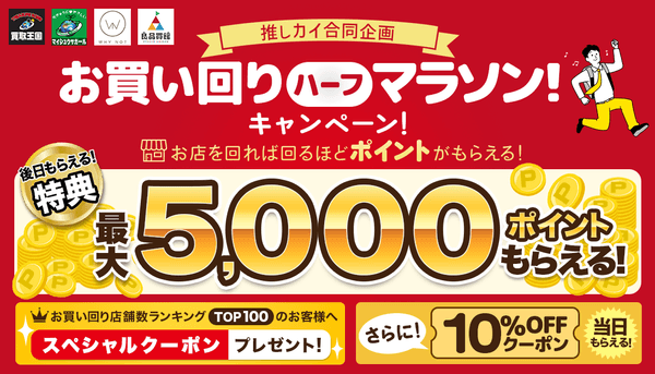 買取王国では、2025年9月19日(金)~2025年9月29日(月)の期間、買取王国を巡って買い物をすると、ポイントやお得なクーポンをゲットできる「お買い回りハーフマラソン!キャンペーン!」を実施いたします。現在「推しカイ!〜推し店舗総選挙2025〜」も絶賛開催中!この機会に是非お得に商品をお買い求めください。