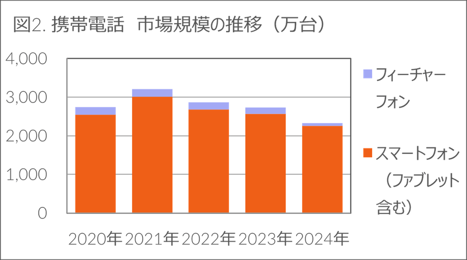 携帯電話は数量前年比15%減の2,330万台となった(図2)。そのうち9割強を占めるスマートフォン(ファブレット含む)が同12%減の2,250万台、フィーチャーフォンが同52%減の80万台となった。 23年12月に施行された法改正による値引き規制の影響や、その駆け込み需要の反動で、24年は年間を通して低調に推移した。携帯電話専門店の店舗数も23年に続き減少した。