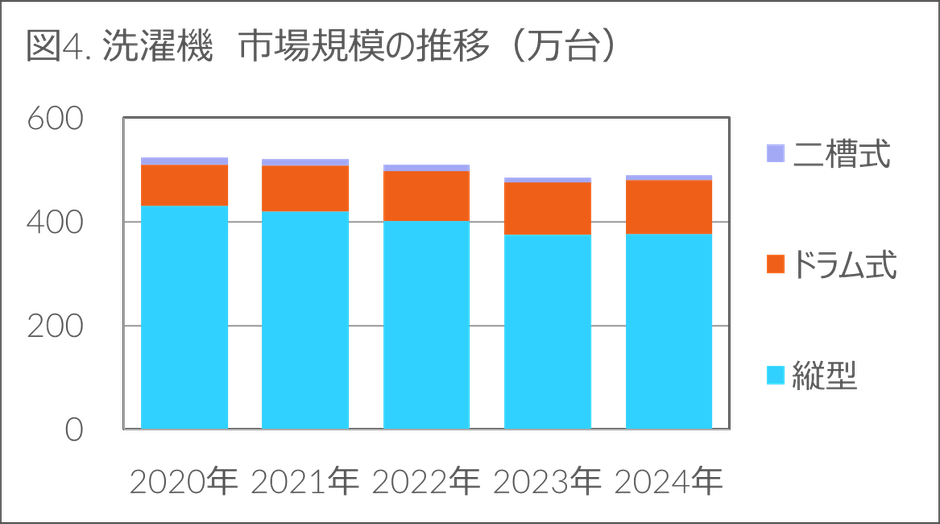 洗濯機は前年比1%増の490万台となった(図4)。洗濯機の中でここ数年拡大を続けていたドラム式洗濯機だが24年は前年微増にとどまった。タイプ毎の数量構成比は、ドラム式が21%、縦型が77%、二槽式が2%となり、前年から変化はみられなかった。ドラム式の拡大が一服したことで、洗濯容量別でみても、大容量(洗濯容量8kg以上)の占める数量構成比は前年と同じ51%であった。税抜き平均価格は前年微減の91,000円となった。