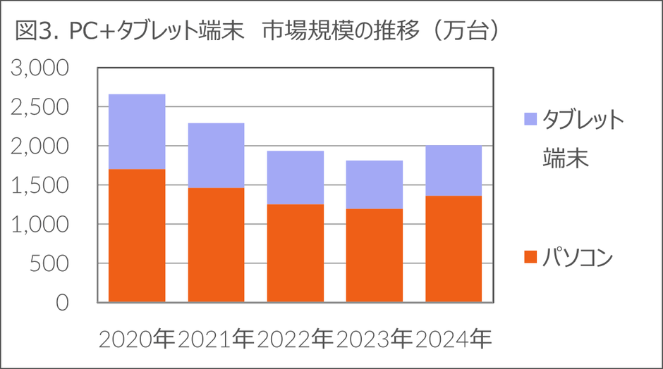 パソコンとタブレット端末市場は、前年比11%増の2,000万台となった(図3)。個人向けは前年比1%減にとどまったものの、法人向けはWindows 10のサポート終了に伴うパソコンの買い替え需要や、GIGAスクール構想特需時に購入された端末のリプレイスなどによって前年比13%増となった。