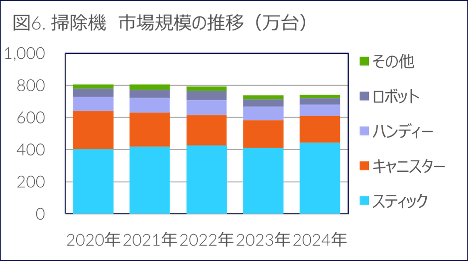 掃除機は前年比0.2%増の740万台となった(図6)。タイプ別にみると、スティックタイプのみ前年の規模を上回った。結果、スティックタイプの数量構成比は前年から4%ポイント拡大し60%となった。キャニスタータイプは前年から1%ポイント減の22%、ハンディタイプは2%ポイント減の9%となった。ロボットタイプは同6%と前年を維持した。掃除機の税抜き平均価格は前年から3%上昇し26,000円となった。