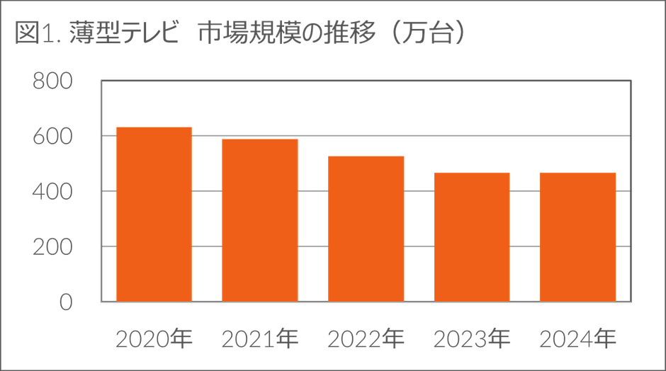 薄型テレビは前年比0.1%増の470万台となり、3年続いていた市場縮小から踏みとどまる結果となった(図1)。24年上半期は昨年からの減少傾向が続いていたが、下半期は上昇に転じた。